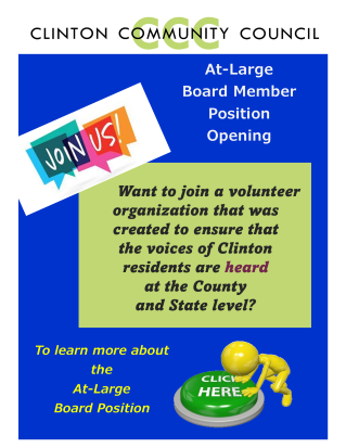 Do you want to help make Clinton an exceptional place to live and work? We’d love to meet you! We’re currently looking to fill an At-large position on our Board. We’re a thirteen-member organization formed to advocate for the needs of the Clinton Community. We work with county and state government as well as other…